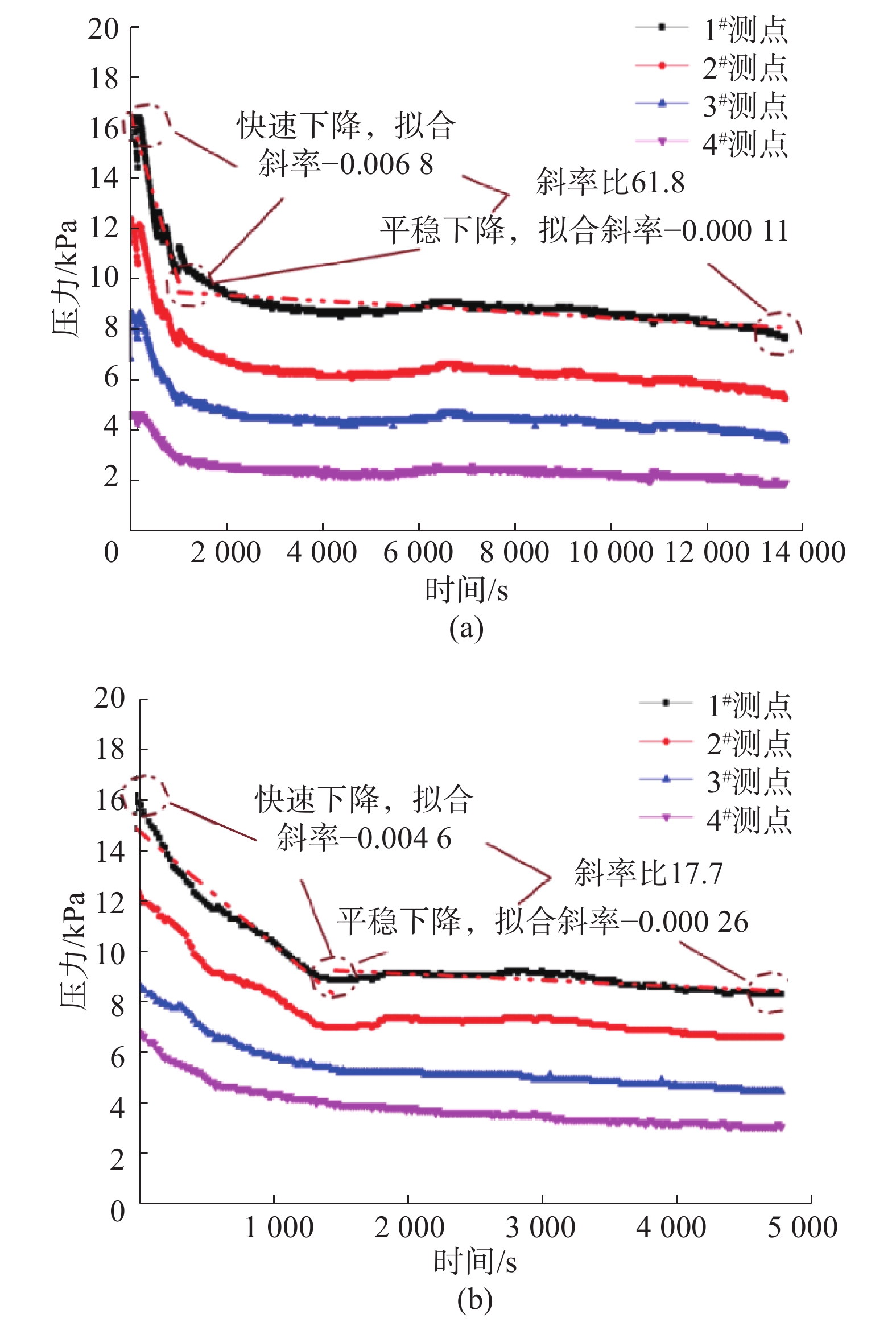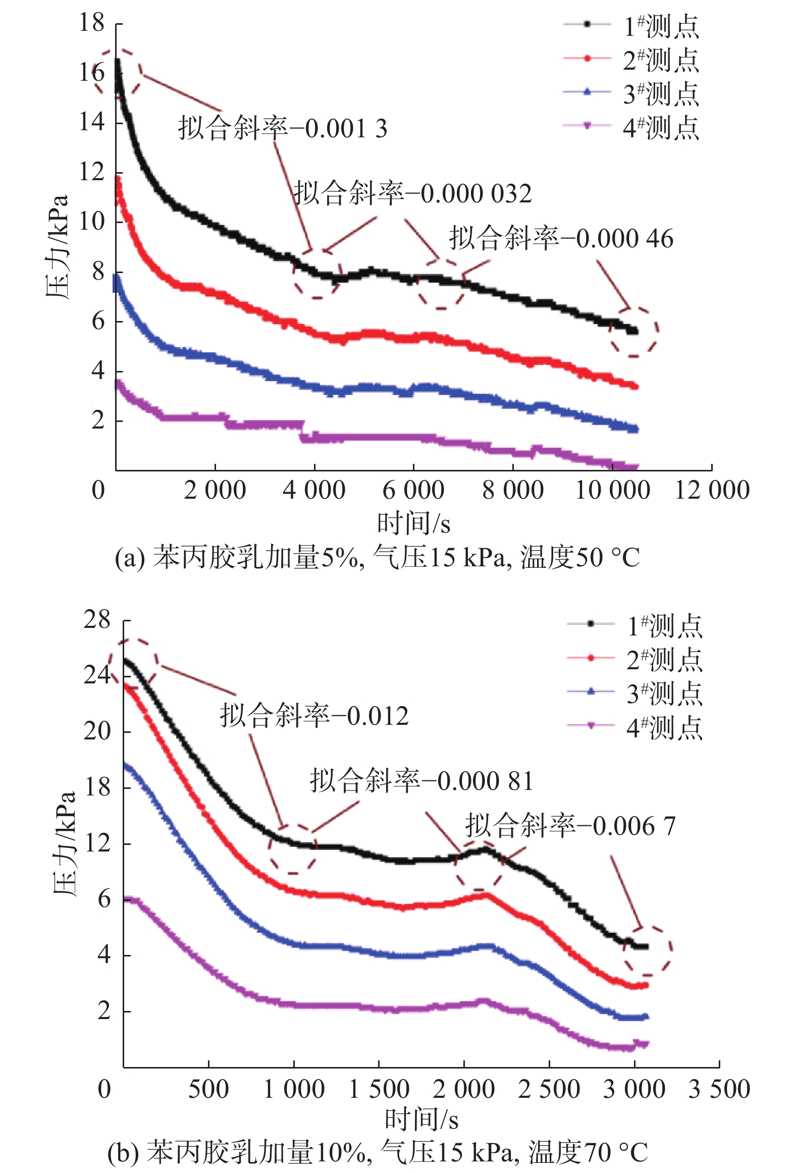 During the WOC of cement slurry, gas channeling in the annulus caused by its weight loss is one of the important factors leading to the sustained casing pressure (SCP). Understanding the weight loss modes and law of cement slurry is an important way to prevent gas intrusion in the annulus. Taking the styrene-acrylic latex anti-gas channeling cement slurry system as the research object, the weight loss test of cement slurry was carried out by means of pressure conduction precision measuring device, and the pressure change data of cement slurry under different latex dosage, temperature, gas pressure and simulated wellbore depth were measured, and the anti-gas channeling effect evaluation and weight loss law analysis were carried out. The test found that the styrene-acrylic latex could still effectively prevent gas channeling when the gas-bearing formation pressure (18 kPa) was higher than the bottom pressure of slurry column (12-16 kPa). In this case, the pressure dropped rapidly after this system formed a thixotropic or gelled structure. As the hydration reaction went on, the pressure decreased slowly, then the pressure of cement slurry dropped rapidly again before the thickening, and the dangerous time of gas channeling should appear near the first inflection point. Based on the research results, the anti-gas channeling performance of cement slurry could be evaluated to select the anti-gas channeling cement slurry system suitable for high-pressure gas wells, and such results could provide test basis for the establishment of cement slurry weight loss prediction model.