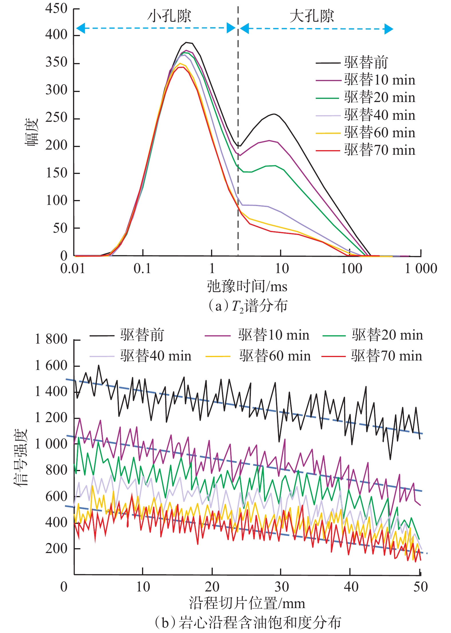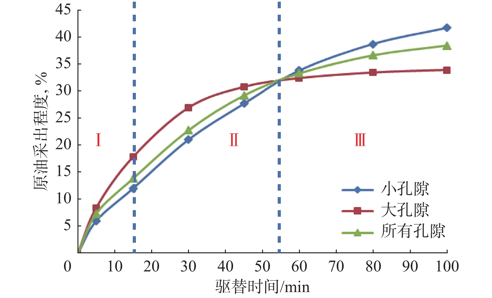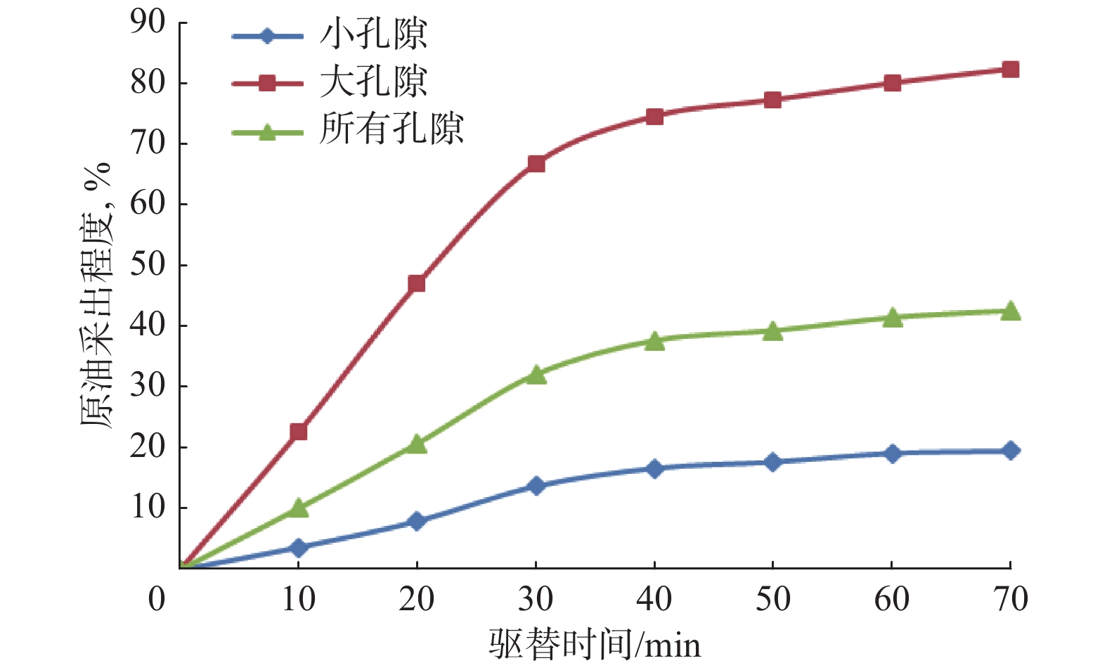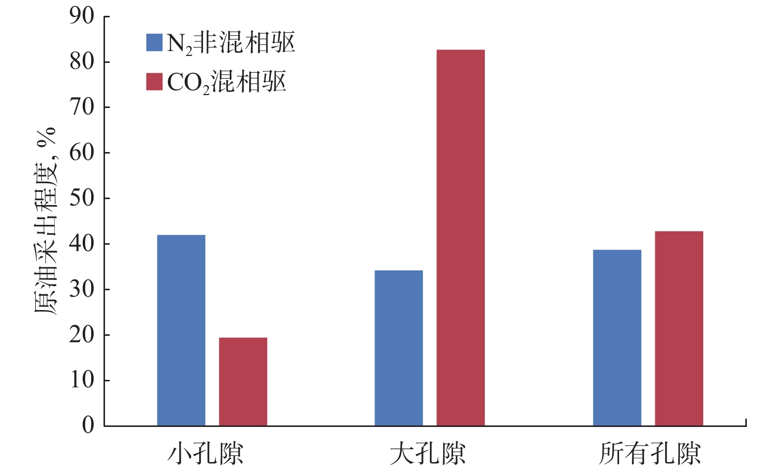 2 miscible flooding, while it is relatively low from small pores. The distribution of microscopic pore structure is the main cause for the difference in recovery percent between large and small pores in the process of N