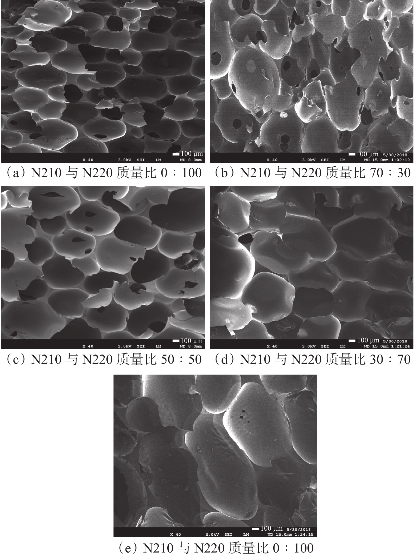 The performance of porous shape memory polymer prepared by single relative molecular mass polyols cannot meet the requirements of well completion, so it is necessary to prepare a porous shape memory polymer with polyols in different relative molecular mass. In order to provide a basis for the preparation of porous shape memory polymers suitable for different downhole conditions, the different porous shape memory polymers are prepared by changing the relative molecular mass ratios of polyols. The influence of relative molecular mass ratios of polyols on their properties were analyzed by testing mechanical properties, glass transition temperature, and thermal sensitivity and by observing the pore structure. Larger relative mass ratio of low relative molecular mass polyols to high relative molecular mass polyols will bring higher hardness, compressive strength and bending strength of porous shape memory polymers; and it will cause lower temperature for glass transition, thermal deformation and the later recovery, and smaller opening rate; moreover, it will lead to larger foaming pore size, pore coefficients and pore wall thicknesses, and stronger structural anisotropy. The research demonstrated that a porous shape memory polymer for well completion can be obtained by adjusting the relative molecular mass ratios of polyols, this kind of polymer for completion has certain mechanical strength, it can meet the requirement for shape recovery under different downhole temperature conditions, possessing the filtering function for formation sands with different radius sizes.