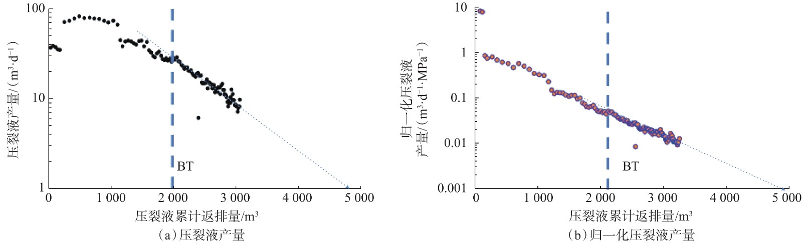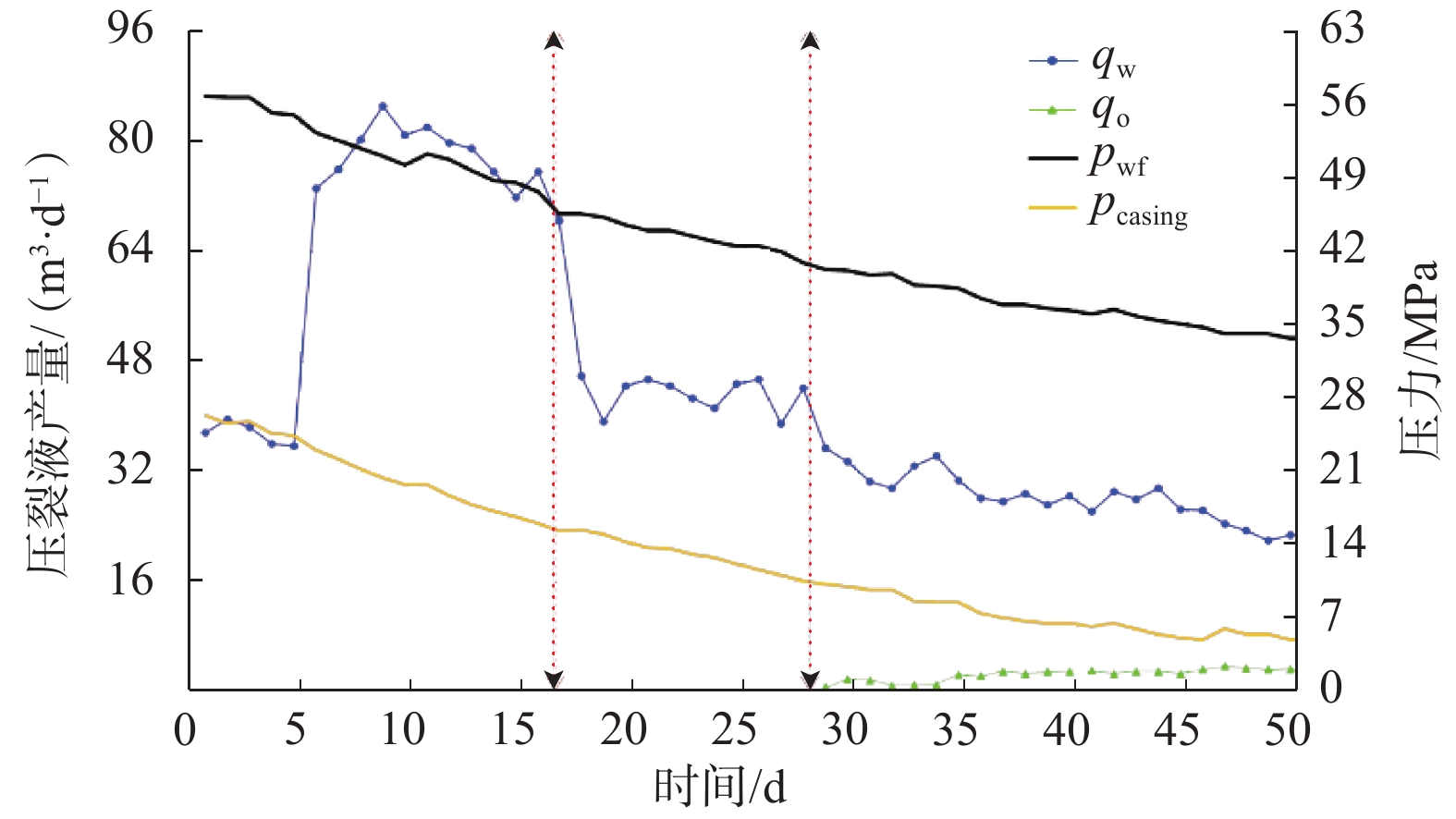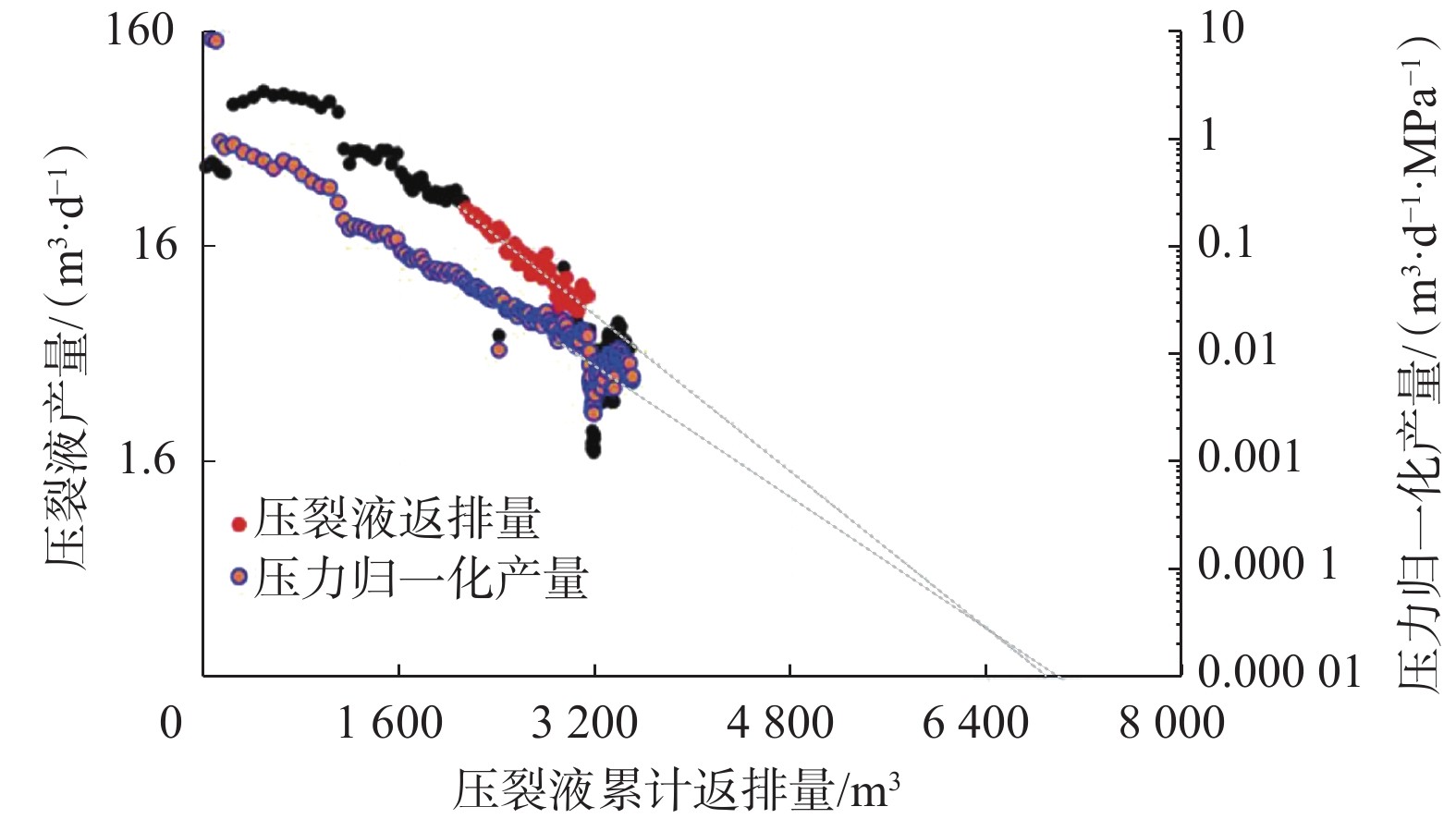 The early flowback history data of fracturing fluid can be used to evaluate multi-stage fracturing effect for horizontal wells, and the effective fracture pore volume is a critical parameter to reflect the fracturing effectiveness. However, current calculation methods of effective fracture pore volume based on the fracturing fluid flowback history shows low accuracy. This paper presents a new method for quantitatively calculating the effective fracture pore volume based on flowback history. On the bases of the latest methodology in North America, the method uses the flowing material balance method of rate transient analysis (RTA) and is combined with a traditional production decline method. Its calculation and analysis process is introduced in detail based on a domestic multi-stage fracturing horizontal tight oil well. The calculation results show that only 21% of the injected fracturing fluid contributes to the fracture conductivity. The results show that the new method can effectively improve the calculation accuracy of the effective fracture pore volume and implement correct evaluation of multi-stage fracturing effect for horizontal wells.