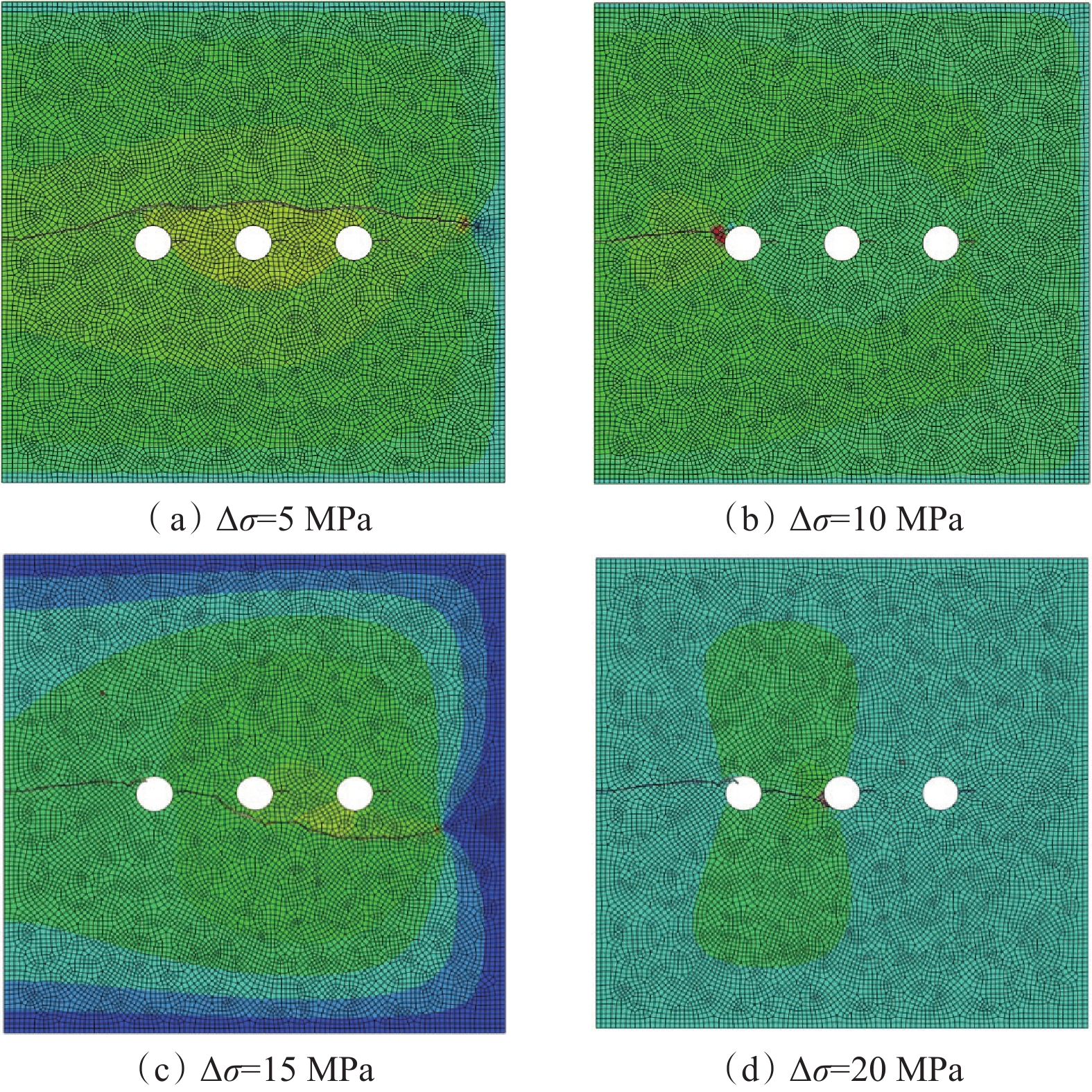 Hydraulic fractures generated in the stimulation of vuggy carbonate reservoirs feature complex propagation as they do not necessarily propagate along the prospected path. In view of this, vuggy carbonate rock samples were prepared based on the analysis of the vuggy characteristics of carbonate reservoirs. With test results of true triaxial hydraulic fracturing, the interference of cavities in the propagation of hydraulic fractures under different horizontal principal stress differences was investigated. Moreover, the extended numerical finite element method was used to analyze the factors affecting the propagation of hydraulic fractures in vuggy carbonate reservoirs and their propagation paths. The results revealed that non-planar propagation would occur when hydraulic fractures encountered cavities when the difference coefficient of the horizontal principal stress was below 0.15, and smaller horizontal principal stress was accompanied by a larger diversion propagation distance and more complex fracture pattern. When the coefficient was between 0.15 and 0.36, hydraulic fractures would overcome the stress concentration of cavities for planar propagation, but they would be captured by cavities encountered along the propagation path. When the coefficient was no less than 0.36, hydraulic fractures would overcome the stress concentration of cavities and penetrate cavities for planar propagation. In addition, the fracturing pressure would decrease as the stress difference increased. The research results can provide a reference for hydraulic fracturing design for vuggy carbonate reservoirs.