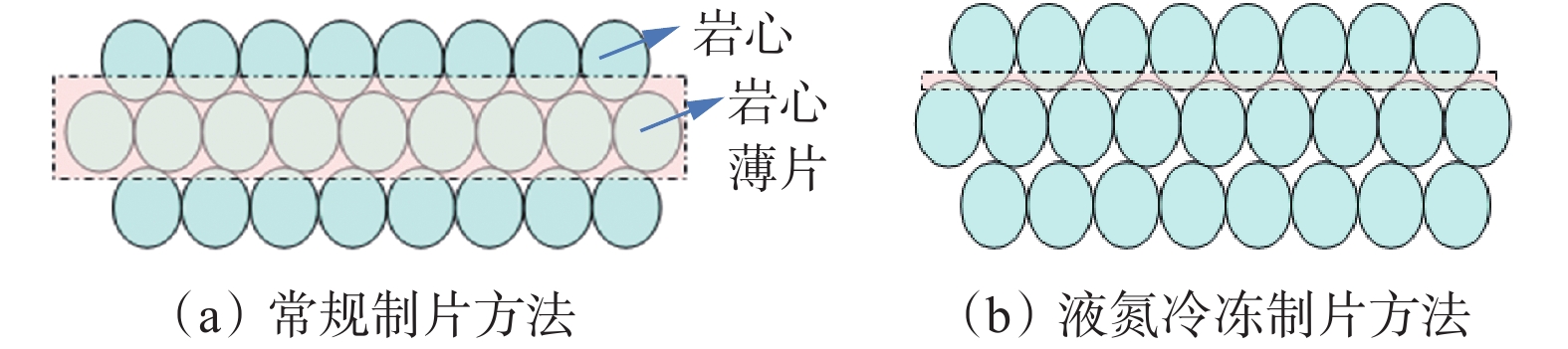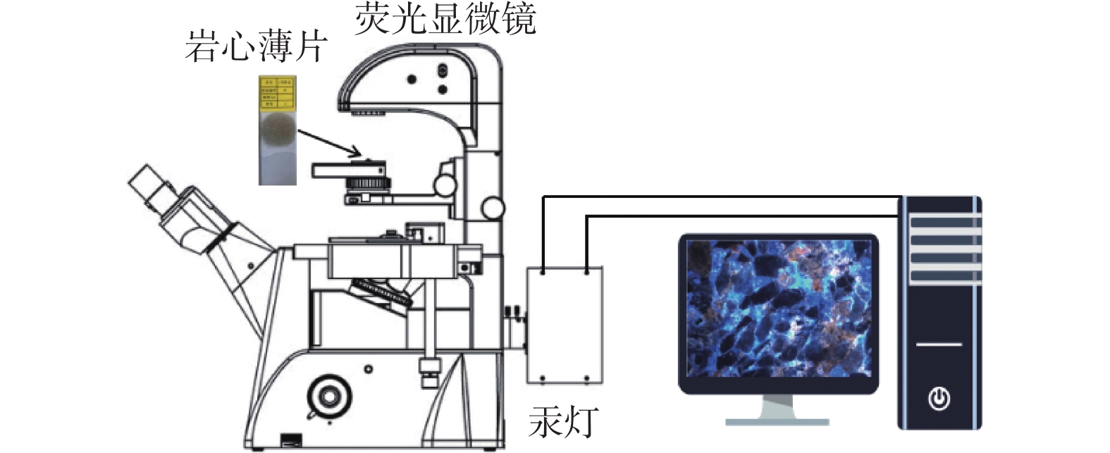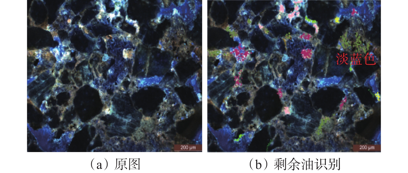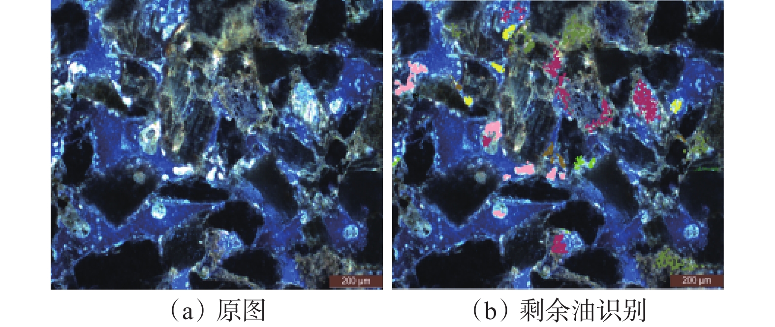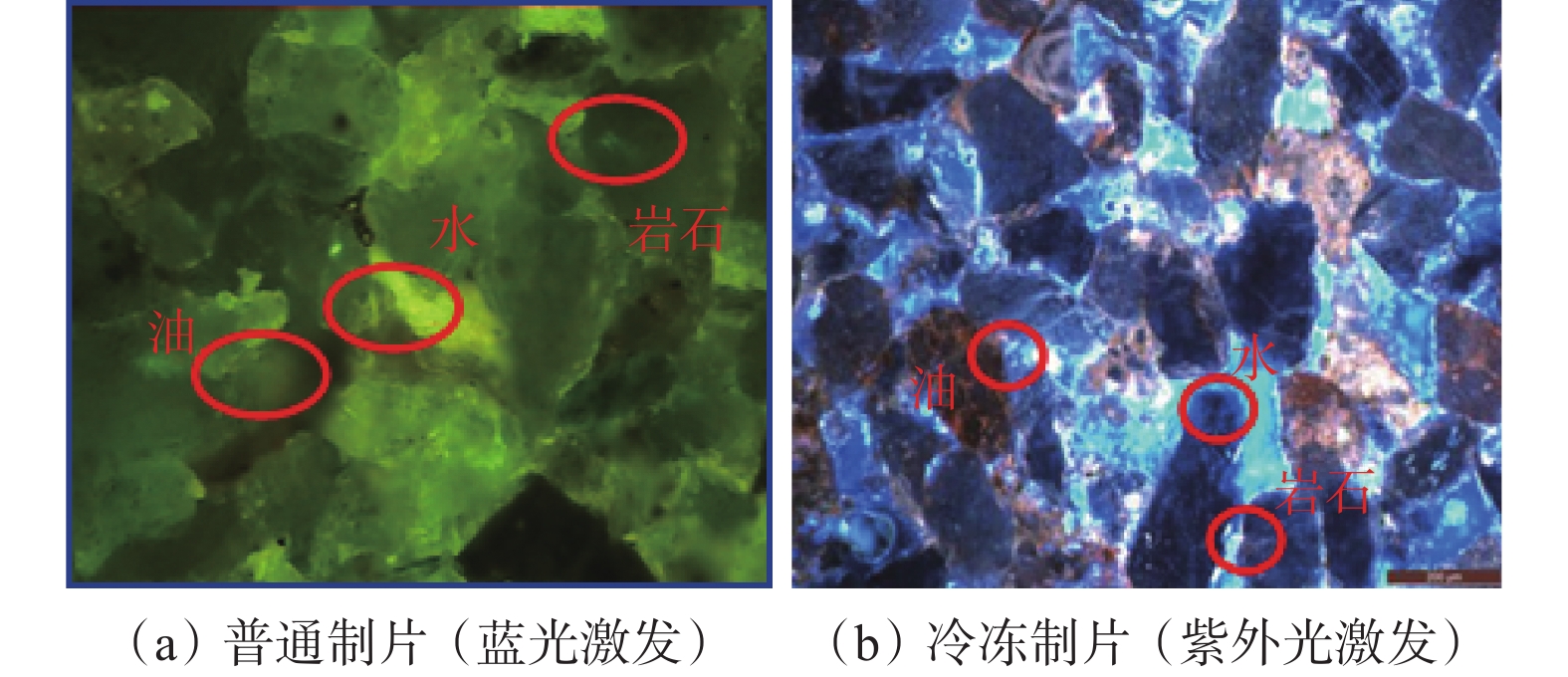 In order to clarify the distribution of microscopic remaining oil in different oil displacement stages and guide the exploration of remaining oil potential in the late stage of water injection development in mature oilfields, cores with different permeability levels from typical blocks were selected for oil displacement experiments. Liquid nitrogen refrigeration technology was used to prepare core slices, and high-pressure mercury lamp fluorescence microscopy was used to analyze the microscopic remaining oil occurrence status during the saturated oil stage, the initial water breakthrough stage, and the post water flooding stage. Through image processing, the occurrence state of remaining oil were further categorized, and the proportions of remaining oil in different states were calculated. The results show that water flooding in medium-permeability core mainly utilizes free-state residual oil, and there is more free residual oil remaining after water flooding, which can be used as a potential target for further exploration. The free-state microscopic residual oil in low-permeability cores was further reduced during the water flooding process, and then the membrane-shaped residual oil in bound state and the throat-shaped residual oil in semi-bound state after water flooding can be used as alternative development resource. The microscopic observation method by high-pressure mercury lamp fluorescence provides a new quantitative approach for the remaining oil analysis and a good reference for the exploration of remaining oil potential in mature oilfields.