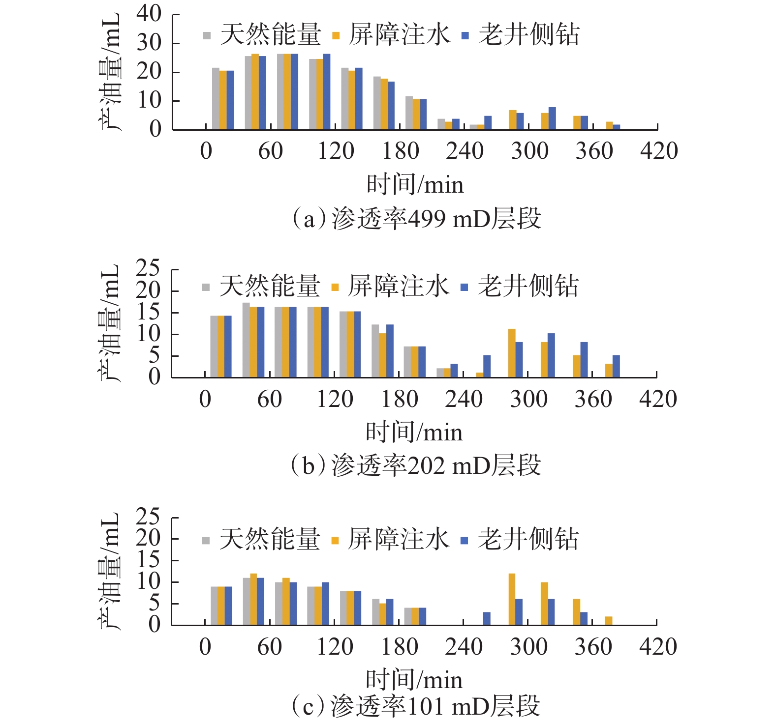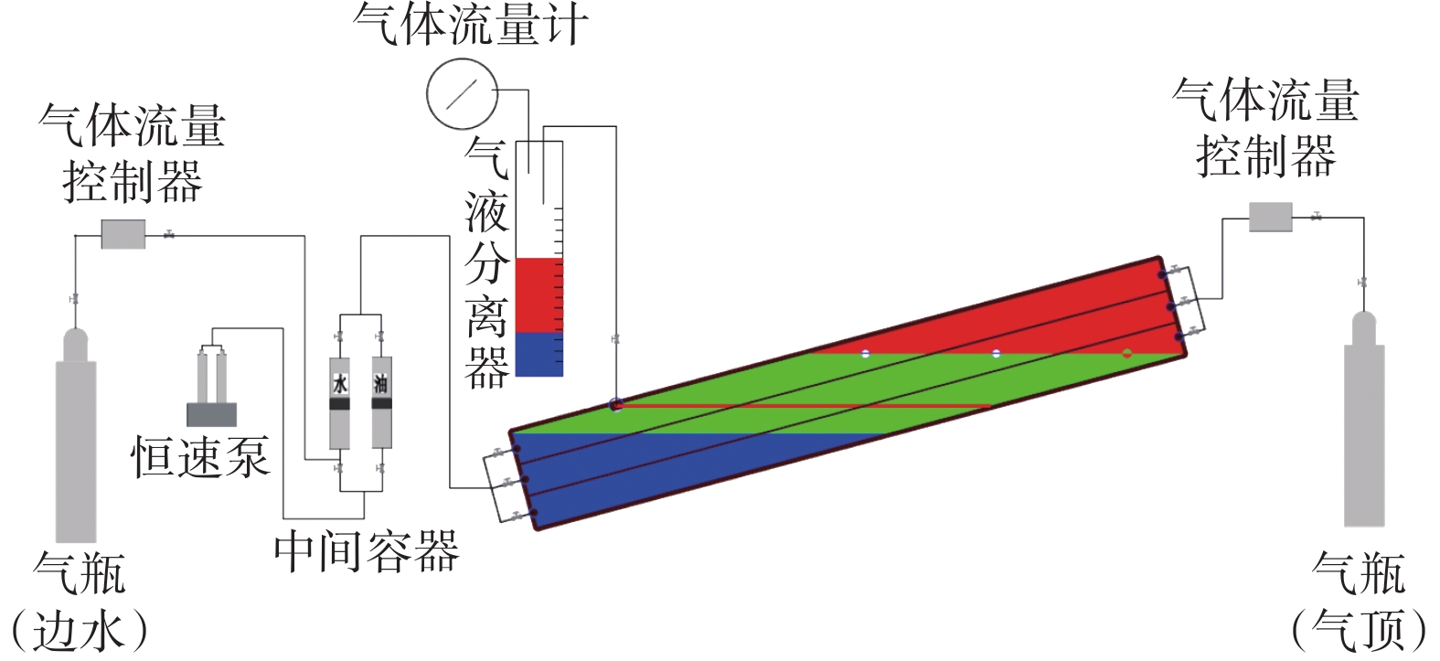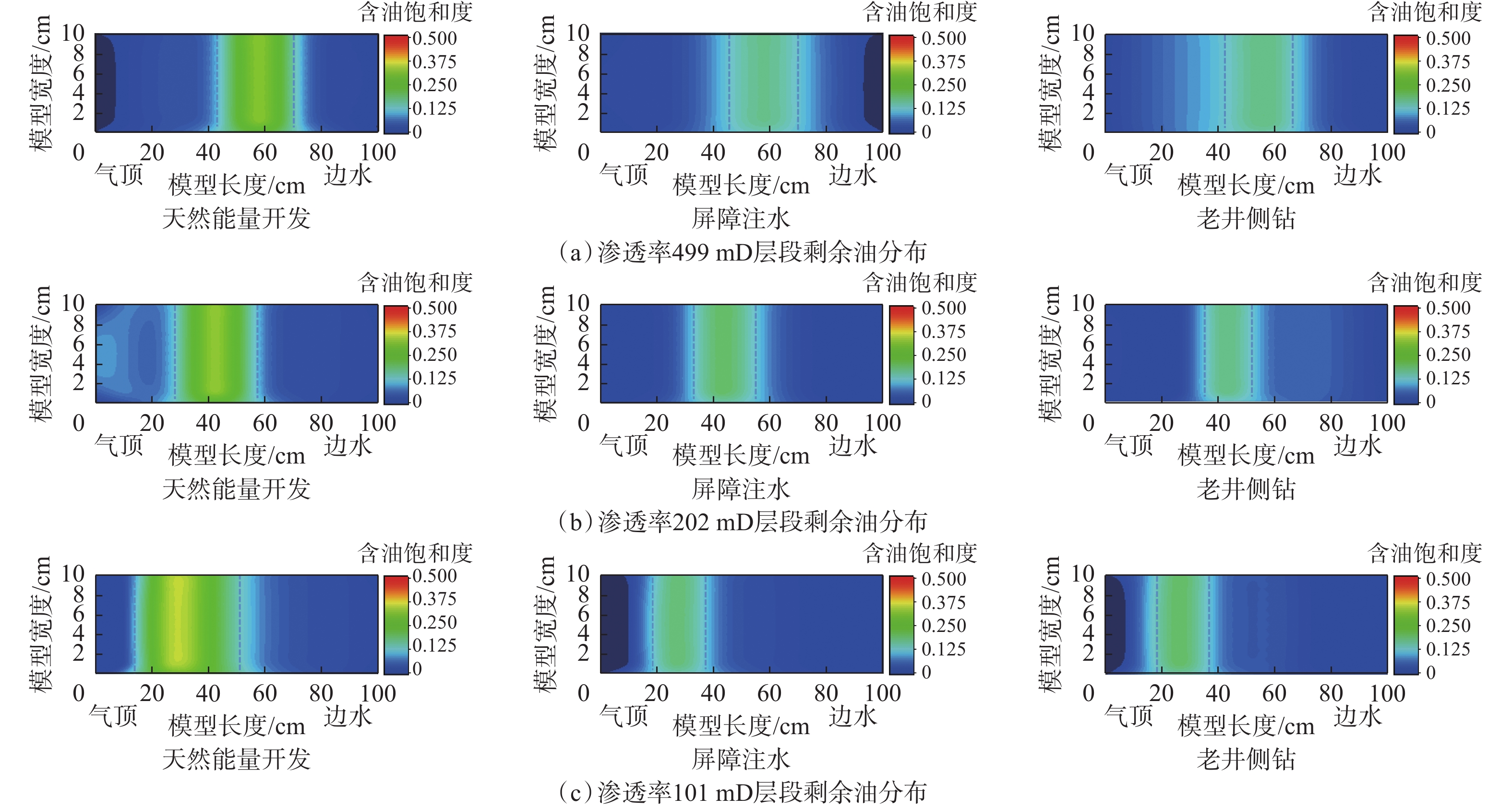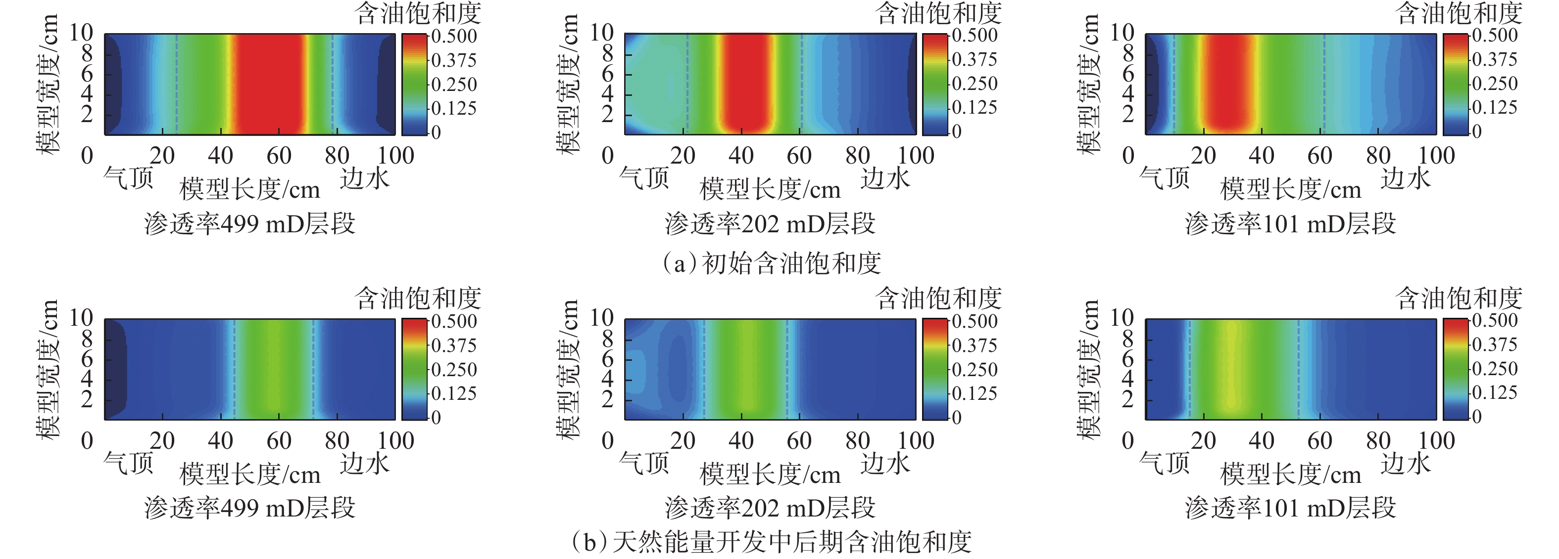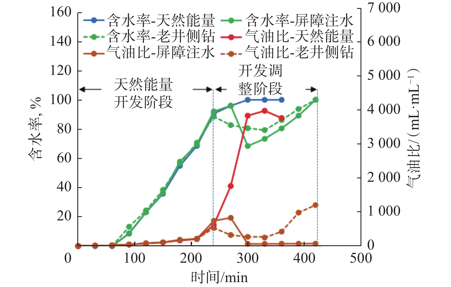 In the middle and late stages of natural energy development, reservoirs with gas cap and edge water are affected by gas channeling and intensified water coning, and the formation pressure drops rapidly. The production declines greatly, and production conditions deteriorate sharply. In order to explore the development adjustment direction of this type of reservoir in the middle and late stages, a large-scale three-dimensional physical model of the reservoir with a gas cap and edge water was designed based on the similarity theory by taking an offshore reservoir with large gas cap and middle edge water as the prototype. Three development adjustment methods and potential tapping effects were studied, namely, continued natural energy development, barrier water injection development, and sidetracking of old wells towards high locations. The experimental results show that the natural energy development of reservoirs with gas cap and edge water is dominated by gas cap energy and affected by gas channeling in the high-permeability layer. Oil enrichment occurs in the upper part of horizontal wells in reservoirs with medium and low permeability, which is the direction for subsequent potential investigation. The barrier water injection can effectively suppress the gas channeling of the gas cap in high-permeability layers and has a significant effect on increasing and stabilizing production in low-permeability layers. The sidetracking of old wells is more effective in improving oil recovery in reservoirs with a high proportion of medium-permeability layers. One old well underwent sidetracking towards higher locations, achieving good on-site application results. The research result can provide a reference for improving adjustment effect of multiple methods to enhance oil recovery.
