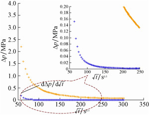 根据压力递减曲线分析,当dΔp/dt趋于0,即压力递减率接近于0时,认为地层压力已经趋于稳定,根据计算结果取t=155 s0.5,得裂缝内压力达到稳定的时间为400.42 min。由此可得,自停泵结束时地层压力恢复稳定的时间(即合理的停泵时间)为446.22 min。