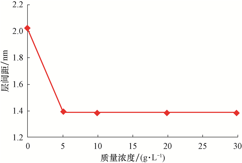 | 图 1 聚胺抑制剂SDJA对黏土层间距的影响 Fig.1 Effect of polyamine inhibitor SDJA on clay interlayer spacing |