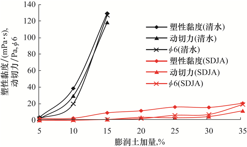 由图2可知,在清水中加入膨润土后,浆液的表观黏度、动切力和六速黏度计的6转读数(φ6)大幅增大;当黏土加量超过15.0%后,浆液黏度太大,已超出了六速黏度计的量程;而3.0%SDJA试液的流变参数受膨润土加量的影响较小,且膨润土加量达到35.0%时仍具有较好的流变性,表明SDJA可有效抑制黏土水化造浆。