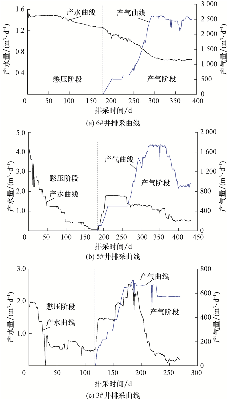 | 图1 3口煤层气井的排采曲线 Fig.1 Production curves of three CBM wells |