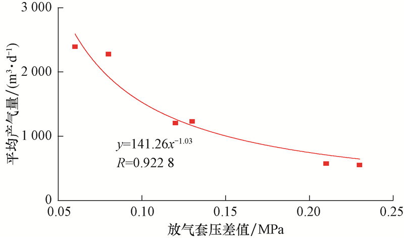 | 图2 放气套压差值与平均日产气量关系曲线 Fig.2 Relationship between casing pressure drop and average daily gas production |