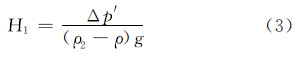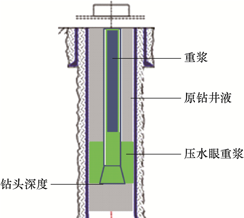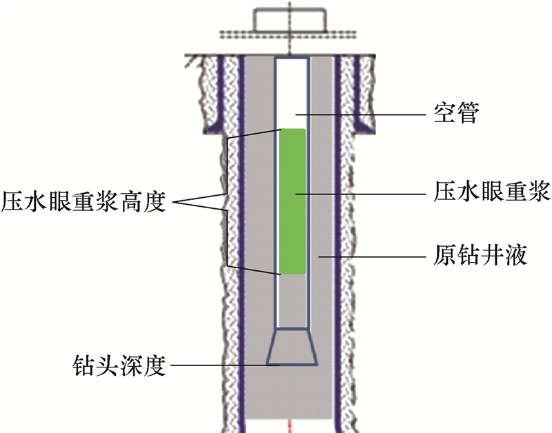 当起钻至设计的钻头深度时,钻具内部的钻井液分布为:压水眼重浆距井口一定高度,重浆底部为原钻井液(见图2)。