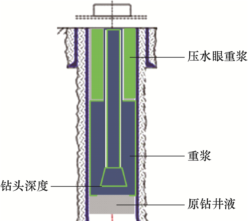 在精细控压钻井的正常钻进中,井底压力为钻井液静液柱压力、循环压耗和井口回压之和;起下钻过程中,井底压力为钻井液静液柱压力和井口回压之和,则此时井口回压为循环期间井口回压及环空压耗之和[1, 2, 3, 4]。因下部钻具组合无法通过旋转控制头,控压起钻中途需转为常规起钻,向井内注入重浆施加附加压力以维持井底压力恒定[5, 6]。重浆沿环空上返期间,井口回压降低。然而,当钻具内的压水眼重浆进入井眼环空时将对重浆注入期间的井口回压产生影响,若注入重浆过程中控制不当而使井底压力产生较大波动,则易引起井下故障[7]。目前国内关于该方面的研究基本还处于空白,现场控压起钻过程中将该部分压水眼重浆忽略不计,因而易引起井底压力较大波动,尤其对于我国西部深层碳酸盐岩地层(如塔中地区窄密度窗口地层)甚至可能诱发井下故障,存在一定的井控风险[8, 9]。为此,笔者分析了精细控压钻井注入重浆过程中控制井口压力时存在的问题,将压水眼重浆与重浆帽组合进行设计;以塔中地区某井为例进行了重浆帽设计,并对简易重浆帽和组合重浆帽进行了差异化分析,表明新技术在保证井筒压力稳定方面效果良好。