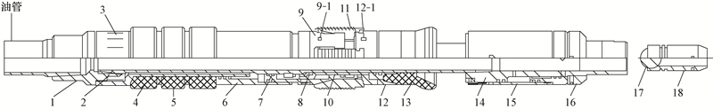 | 图 1 自封压缩式封隔器坐封后的状态示意 Fig. 1 Structure sketch of self-sealing compression packer after its setting 1.上接头;2.中心管;3.防砂过液孔;4.外套管;5.胶筒;6.液压缸;7.活塞;8.锁环;9.锥体;9-1.坐卡剪钉;10.坐卡支撑管; 11.卡瓦;12.皮碗骨架;12-1.解封剪钉;13.皮碗;14.下接头;15.皮碗压缩套;16.压缩套限位;17.球;18.坐封球座 |