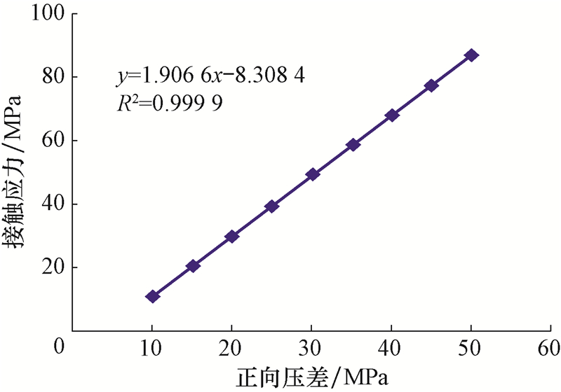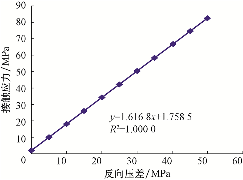 从图 2还可以看到:最低坐封压力应大于4.36 MPa;正向压差为10.00 MPa时接触应力为10.76 MPa,接触应力比正向压差大0.76 MPa;正向压差为15.00 MPa时接触应力为20.29 MPa,接触应力比正向压差大5.29 MPa。因此,胶筒承受反向压差时,建议坐封压力不小于10.00 MPa。由图 3可知:10.00 MPa坐封压力下,反向压差为0时接触应力为1.76 MPa,与图 2的结果不同,是因曲线回归时的误差所致;反向压差为35.00 MPa时接触应力为58.35 MPa,表明利用反向压差增强胶筒密封性的效果显著。