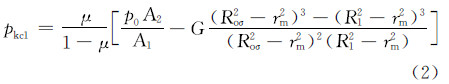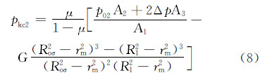 式中:pkc2为胶筒承受反向压差时轴向压缩产生的接触应力,MPa;A3为液压缸的内横截面积,mm2;R3为液压缸内半径,mm;p02为坐封压力,MPa。