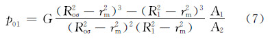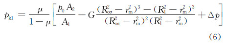 式中:pkc1为坐封阶段轴向预压形成的初封接触应力,MPa;μ为胶筒的泊松系数;A1为胶筒变形后的横截面积,mm2;A2为自封皮碗受压力的横截面积,mm2;p0为坐封压力,MPa;G为胶筒的抗剪弹性模量,MPa;Roσ为套管内半径,mm;rm为套管外半径,mm;Ro为胶筒内半径,mm;R1为胶筒外半径,mm;R2为自封皮碗最小内半径,mm。