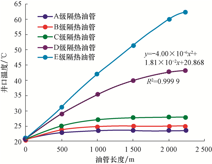 2.1 油管类型及长度优化Y12X2X3井在生产初期采用内衬油管,由于其导热系数较高而使保温效果不佳,需要选择导热系数较低的隔热油管。根据隔热油管的行业规定,按导热系数分为A,B,C,D和E 5个等级,其导热系数分别为0.08~0.06 ,0.06~0.04,0.04~0.02,0.020~0.006和0.006~0.002 W/(m·℃)[23]。计算采用上述5个保温级别隔热油管时的井口温度,结果见图 4(仅列出了D级隔热油管的回归函数)。