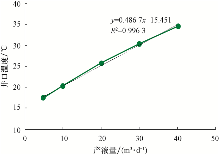 从图 5可以看出,井口温度随产液量的增加基本呈线性增加的趋势,产液量每增加10 m3/d,井口温度平均提高5 ℃。分析认为,这是由于较高的产液量会缩短流体的举升时间,减少流体向地层的传热量,有助于提高井筒流体温度。根据Y12X2X3井的产能情况,建议将产液量提高到20 m3/d以有效提高井口温度。
