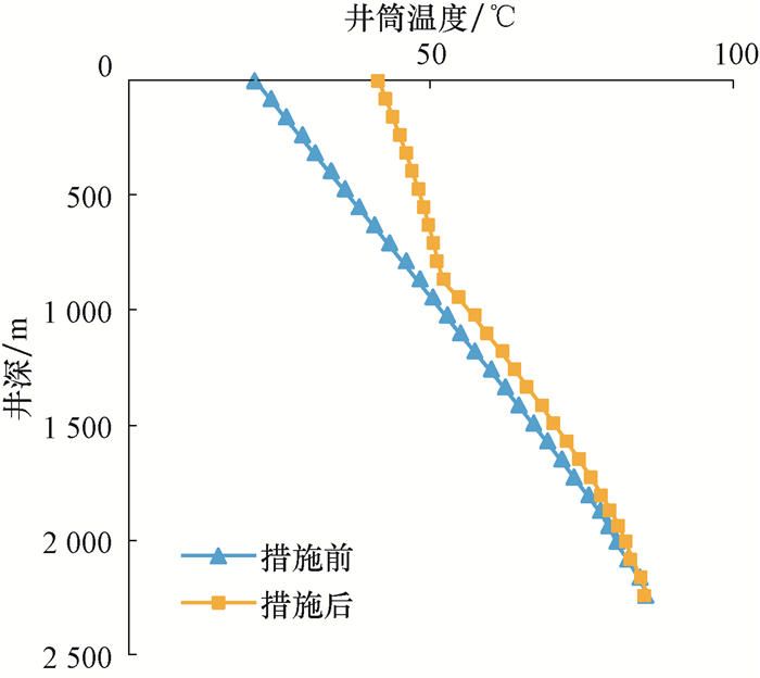 由图 6可知,Y12X2X3井采取保温措施后的井筒温度得到有效改善,1 000 m以上井段温度场改善尤为明显。该井采取保温措施后,井口温度升高至41.5 ℃,较措施前井口温度升高了20.5 ℃,井筒温度改善效果非常显著。