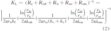 井筒到水泥环外壁间的总热阻包括油管内壁对流换热热阻、油管导热热阻、环空对流及辐射换热热阻、套管导热热阻和水泥环导热热阻,井筒到水泥环外壁间单位长度油管综合传热系数为总热阻的倒数,计算式为: