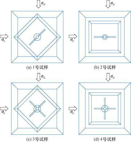 为分析不同分支井眼数和径向井眼方位对裂缝起裂与扩展的影响规律,共制作试样4块,见图2(σH为最大水平主应力,MPa;σh为最小水平主应力,MPa):1号和2号试样为2分支径向井,1号井眼方位与水平应力方向成45°角,2号井眼方位平行于最小水平主应力方向;3号和4号试样为4分支径向井,3号试样井眼方位与水平应力方向成45°角,4号试样井眼方位与水平应力方向相同。