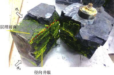 2号试样表面可以观察到较为清晰的天然裂缝(见图4(a)),压裂后这3条天然裂缝被径向水平井所在的水平裂缝沟通(见图4(b)),均未与主井眼相交,说明该试样是从径向井所在层理面起裂。