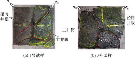 3) 水平起裂+主井眼多点起裂。1号、3号试样的压裂结果如图6所示。从图6可以看出,1号、3号试样除径向水平井所在的层理面被开启之外,主井眼周围也产生多条垂直裂缝与主井眼相连,其中沿最大水平主应力方向有明显的垂直缝开启。
