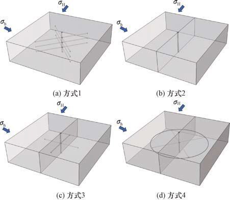 完井方式4:径向水平井压裂完井,径向水平井所在层理水平起裂,同时伴有沿最大水平主应力方向的垂直裂缝与主井眼相交,两条裂缝半径均为60.0 m,径向井眼沿对角线布置,单层4分支。