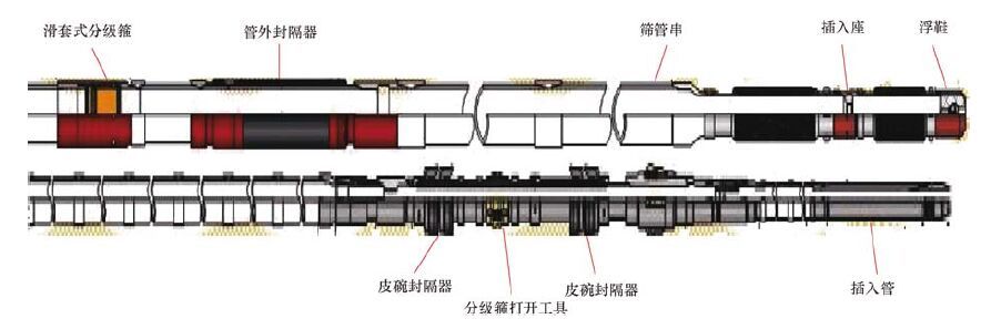 为了真正实现筛管顶部固井免钻免捞,必须解决固井后管内附件残留的问题,并且不能影响工艺实施效果。通过对常规筛管顶部固井管柱的结构和关键工具进行优化组合,将固井后管内残余附件一次提出,并且注替水泥时的局部密封、分级箍操作不受影响。免钻免捞筛管顶部固井管柱组合由内管柱和外管柱两部分组成。