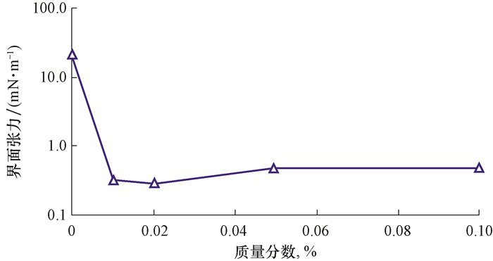 3 结论1) 界面张力随表面活性剂质量分数增加呈现先降低、后略升高、最后趋于平稳的特征,在低渗透油田开发时,应通过试验找到达到平衡时的最小质量分数,从而使效益最大化。