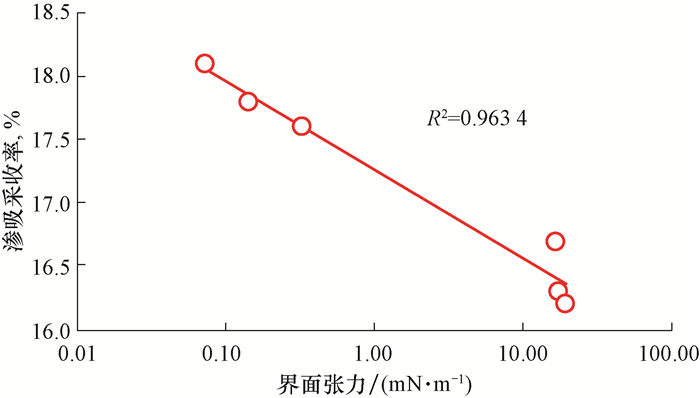 低渗储层的渗吸是指在低渗储层中多孔介质自发地吸入某种亲润湿流体的作用,渗吸作用决定着低渗透油田原油的产量以及采出程度。渗吸作用受许多因素的影响,如渗透率、基岩形状、边界条件、流体黏度、界面张力和润湿性等[1]。界面张力和岩石润湿性是影响毛细管压力大小的决定性因素,因此研究表面活性剂对这两个因素的影响,对充分发挥渗吸作用具有指导意义。目前,已有多位学者[2-6]研究了表面活性剂对渗吸作用的影响,发现表面活性剂有助于提高渗吸采收率,然而关于表面活性对油水界面张力、水湿表面润湿性、毛细管压力和渗吸采收率的影响尚未进行系统研究。为此,笔者通过试验方法利用不同表面活性剂及其复配剂系统研究了表面活性对油水界面张力、水湿表面润湿性、毛细管压力以及渗吸采收率的影响,发现界面张力的降低有利于提高低渗透油藏的采收率,并且得到了岩样渗吸采收率与油水界面张力和毛细管压力的关系式。