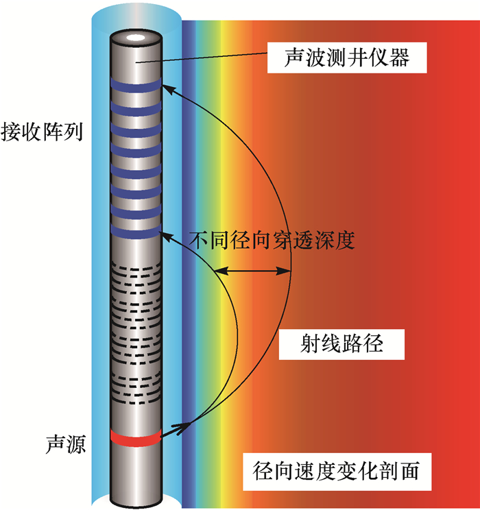 | 图 1 速度径向变化地层中的声波射线路径示意 Fig.1 Pathways of acoustic rays in formations with velocity radial changes |
