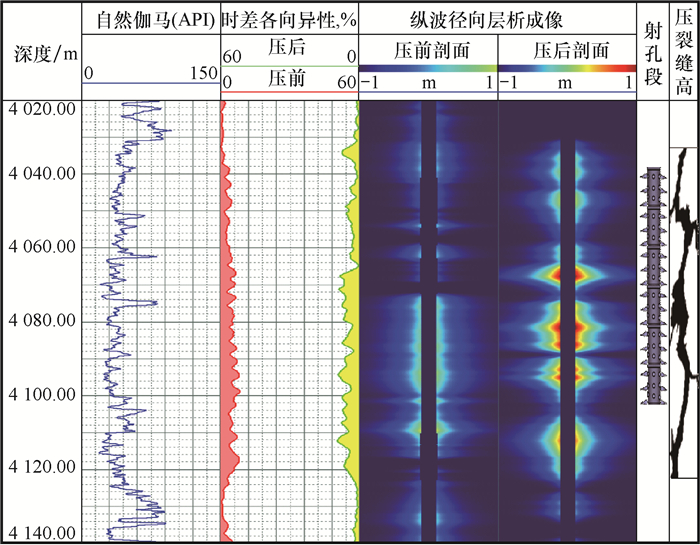 | 图 2 XX-3井H4层压后声波时差各向异性和纵波层析成像评价组合 Fig.2 Acoustic time anisotropy and radial compression-wave velocity variation imaging for fractures in H4 layer of Well XX-3 |