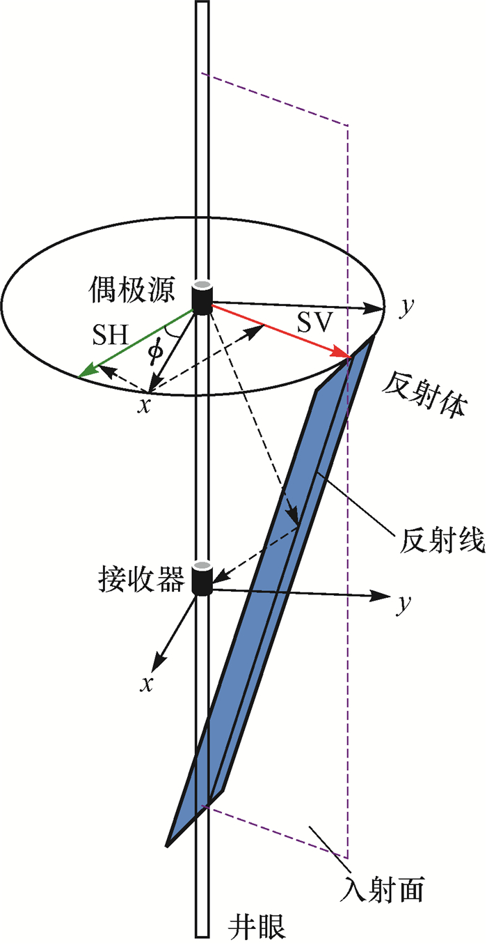 X.M.Tang[13]于2004年提出了偶极横波远探测声波成像方法,该方法采用偶极子声源在井中向井外发射横波,并在井中接收由井外地质体反射回来的横波。图 3为单井偶极横波远探测的原理示意图。从图 3可以看出,偶极子声源向井外辐射的弯曲波,可分解为平行于反射体的水平偏振的横波(SH波)和垂直于反射体的垂向偏振的横波(SV波),SH波和SV波遇到反射体后会形成反射波而被接收器接收到,通过对接收到的反射波信息进行提取,就可以得到反射体的位置及走向[13]。偶极子声源的频率约为2~5 kHz,横向探测深度较深(可达20~30 m)。此外,由于偶极子声源的指向具有方向性,采用多分量(实际中为四分量)的偶极发射和接收,可以确定反射体界面的方位[14]。但该方法不能确定该反射体是在井的右侧还是井的左侧,换言之,该方法只能确定反射体的走向,不能确定其倾向(具有180°不确定性)。