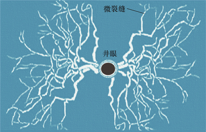 储层被压裂后,一般会有单向缝和网状缝2种裂缝形态,不管形成哪种类型的裂缝,在主裂缝的周围都会产生大量走向不过井眼的微裂缝[15],裂缝切面如图 4所示。这些裂缝就像在井眼周围发育的一个个反射界面,而在偶极声波远探测成像图上,储层被压开处会看到明显的反射界面,没有压开的地方则与压裂前的偶极声波远探测成像图基本保持一致,通过对比压裂前后偶极声波远探测成像有助于评价裂缝井眼轴向上的发育高度。