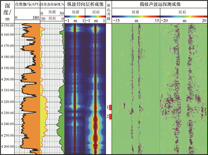 2) 纵波层析成像和偶极声波远探测成像2种阵列声波测井处理方法,能够弥补声波时差各向异性的不足,不仅可以有效判别压裂裂缝高度,还可以在一定范围内评价压裂裂缝的径向长度,进一步提升了压后评价效果。目前该技术已经在西湖凹陷2口探井进行了试验,取得了较好的效果。