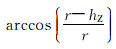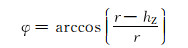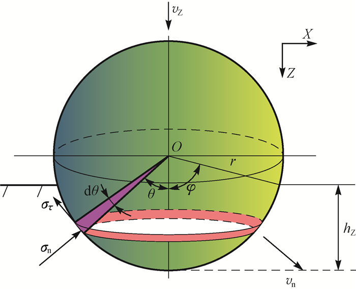 式中:φ为粒子冲击破岩深度所在平面与球形粒子表面的相交线上的任意点的法线与Z轴的夹角,(°);hZ为粒子冲击破岩深度,m。
