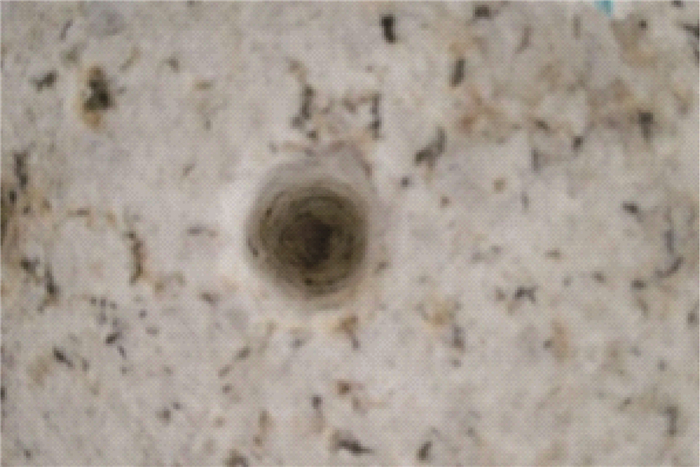 粒子冲击钻井技术以深井硬地层破岩为研究背景,目标试验层位主要集中在西南油气田荷包场、大猫坪、龙会场等区块的须家河组地层。故试验采用花岗岩岩心,为与理论模型的计算相对应,试验前测试了岩性参数,岩石密度2 572.6 kg/m3,弹性模量23.41 GPa,泊松比0.30,抗压强度67.93 MPa,抗剪强度9.82 MPa,体积应变0.10,滑动摩擦系数0.04。粒子冲击破岩试验后岩样的形态如图 4所示。