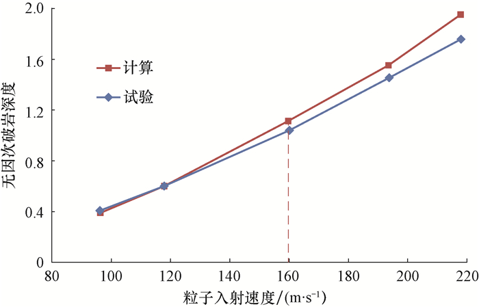 从图 5可以看出,无因次破岩深度的理论计算值与试验值均随着粒子初始入射速度增大呈线性增加。这是因为质量相同的粒子,初始入射速度越大,粒子所具有的动能越大,冲击破岩时作用到岩石上的能量越大,破岩深度就越大。从图 5还可以看出,无因次破岩深度的理论计算值与试验值较为吻合,说明利用动态空腔膨胀理论建立的粒子冲击破岩深度理论模型是正确的,可用于冲击破岩机理的理论分析。