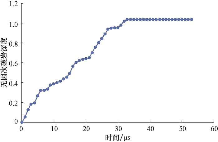 从图 6可以看出,粒子以160 m/s的入射速度冲击岩石后,33 μs时粒子速度降为0(即无因次破岩深度不再增加),此时破岩深度达最大,无因次破岩深度为1.04。粒子冲击破岩的无因次破岩深度随破岩时间增长表现出对数增长的规律,且呈快慢交替的阶跃式增长。这是因为岩石内空腔膨胀的过程是一个能量转化、积累和释放的过程,粒子冲击岩石的动能转化为岩石的内能,促使岩石内细观裂纹的生成、扩展和汇聚,形成局部的球形破碎核。当该破碎核的能量蓄积到一定程度时,空腔迅速膨胀使能量释放,导致空腔周围岩石受到拉伸剪切作用而迅速破碎,此时破碎坑深度快速增加;之后,岩石破碎核继续蓄积能量,破碎坑深度缓慢发展;该过程交替进行,实现岩石的跃进式破碎。另外,粒子的部分动能以球面应力波的形式在岩石中传播,也是一个需要时间的过程。