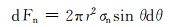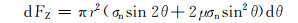 图 2中,θ为球形粒子表面某点的法线方向与Z轴的夹角,取粒子表面一个微元,所对应的角度为dθ。该微元表面受到的法向应力为σn,微元表面和岩石之间的摩擦产生摩擦应力στ,即切向应力。