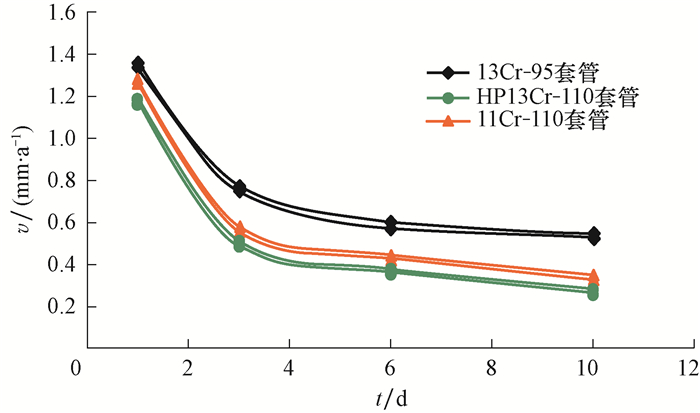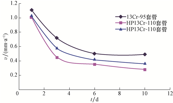 2 套管耐CO2腐蚀性能分析 2.1 CO2腐蚀速率试验选取13Cr-95、HP13Cr-110和11Cr-110等3种材质套管样品, 加工成直径60.0 mm的1/6圆弧试样,各种材质套管试样分别取4个,用砂纸打磨后称重。徐深气田地层压力一般为35 MPa,通过分压计算,其CO2分压0.77~3.10 MPa,平均分压1.80 MPa。取最高CO2分压3.10 MPa,分别在温度80,100,120和140 ℃条件下进行试验,试验时间分别为1,3,6和10 d,分别对试样表面用蒸馏水冲洗以去除腐蚀介质,然后烘干。去除腐蚀产物后,用电子天平称重,计算试验失重和平均腐蚀速率,分别绘制3种材质套管在温度80 ℃和100~140 ℃条件下套管腐蚀速率随时间的变化曲线,结果见图 1和图 2。