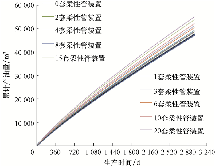 图 4为采用鱼骨刺柔性管完井未连通主要缝洞体时,A水平井生产3 000 d时的累计产油量模拟结果。从图 4可以看出,该井累计产油量随鱼骨刺柔性管装置数量增加而增加,与未采用鱼骨刺柔性管完井相比,采用2,4,6,8,10,15和20套鱼骨刺柔性管装置生产3 000 d的累计产油量分别增加916,1 835,2 839,3 750,4 741,6 393和7 506 m3。