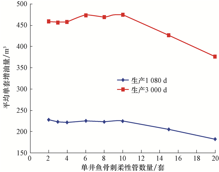 | 图 5 采用不同数量鱼骨刺柔性管装置完井时平均单套装置的增油量 Fig.5 Incremental production from one set of flexible fishbone pipes in wells completed with fishbone pipes |