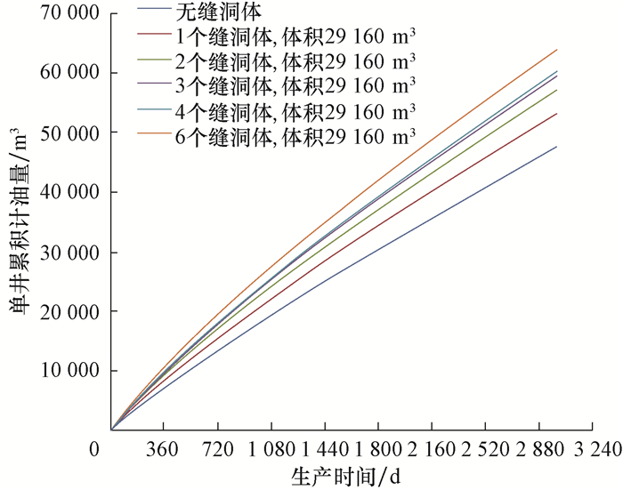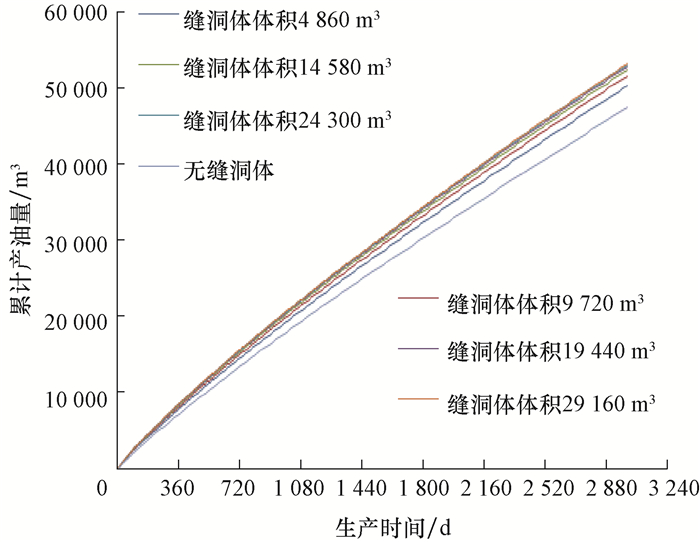当鱼骨刺柔性管连通主要缝洞体时,采用局部网格加密和修改局部网格属性的方法建立了分支井眼连通缝洞体的地质模型。当A水平井采用1套鱼骨刺柔性管装置完井连通1个缝洞体时,累计产油量的模拟结果见图 6。从图 6可以看出,与未连通缝洞体相比,连通1个缝洞体时A水平井的累计产油量显著增加,且随着缝洞体体积增大,其生产3 000 d时的增油量也不断增大。