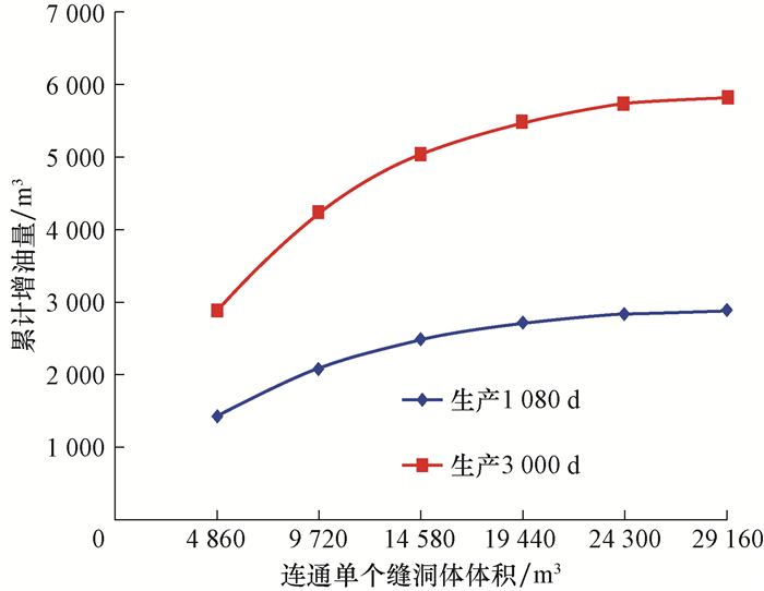在图 6模拟条件下,连通1个不同体积缝洞体与未连通缝洞体相比,不同阶段累计增油量的模拟结果见图 7。从图 7可以看出,与未连通缝洞体相比,连通1个缝洞体后单井累计增油量随缝洞体的体积增大而增大,但是增油量随着缝洞体的体积增大而增大的幅度变小,当缝洞体的体积超过20 000 m3时,增油量增加不明显。