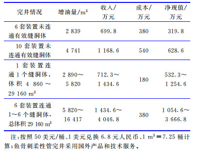 表 1为A水平井采用鱼骨刺柔性管完井生产3 000 d时的经济评价模拟结果。从表 1可以看出,水平井采用6套和10套鱼骨刺柔性管装置完井但未连通有效缝洞体时,采用国外产品和服务,生产3 000 d时的净现值分别为319.8和628.6万元;当连通有效缝洞体时,净现值随着连通缝洞体的体积增大而增大,随着连通缝洞体的数量增加而增大,本文条件下连通6个缝洞体时的净现值为3 666.8万元。总体来看,采用鱼骨刺柔性管完井在目前油价水平下可以取得较好的经济效益。