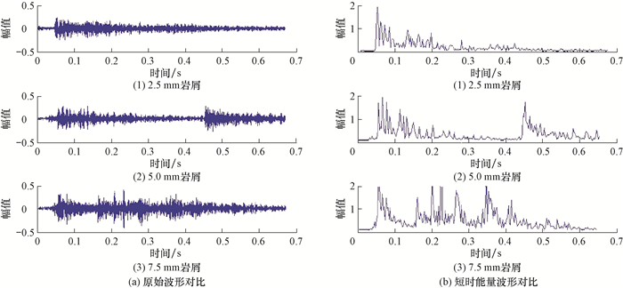 测试过程中保持正常钻进的注气量,从排砂管的岩样注入口依次投入3种岩屑,得到典型音频信号原始波形及其短时能量波形(见图 4)。