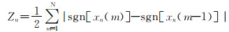 由文献[12]可知,在表征声音的特性时,短时能量反映声音幅度的变化,短时过零率为一帧信号中采样数值符号改变的次数,可反映声音的频谱特性,对不同声音具有良好的区分度。因此,笔者提出了一种改进的MFCC参数,在原12维MFCC参数的基础上增加短时能量和短时过零率2个参数,构成新的特征参数,命名为MFCC_EZ参数。短时过零率计算公式为: