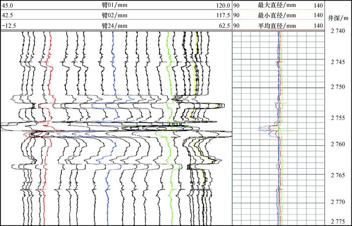 四川某井MIT24臂井径成像测井结果如图 3所示,通过测得的24条沿套管内壁均匀分布的半径曲线,可以看出套管发生剪切变形,发现井深2 757.00 m处的井径变形量最大,约为10.0 mm,可以认为该裂缝的滑动距离约为10.0 mm。