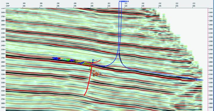 威X井从井深2 015.4.24 m开始第一段压裂,直到第9段压裂施工一直正常,在压裂第10、11和12段时,微地震监测发现井筒下方数据出现异常点,在压裂第13段时,桥塞无法下入,说明套管发生了变形。将微地震事件点在地震剖面上进行投影(见图 5),可以看到异常点发生在断层上,说明在压裂过程中激活了断层,断层滑动导致了套管变形。
