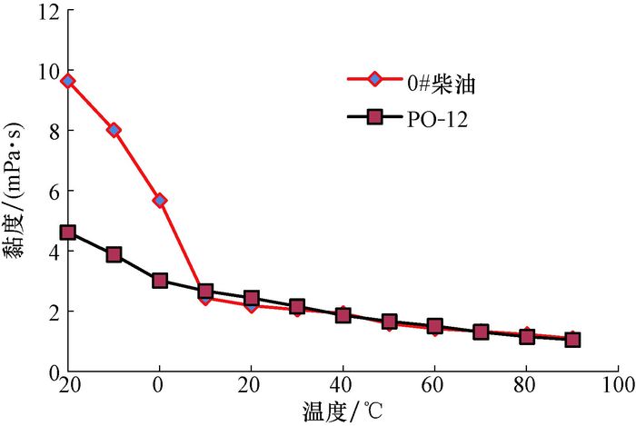 2.2 黏温特性在钻井过程中,基液的黏度越低、温度对其的影响越小,越容易配制出性能优良的钻井液。采用布氏黏度计,在相同条件下测定柴油和PO-12的黏温变化规律,结果见图 1。